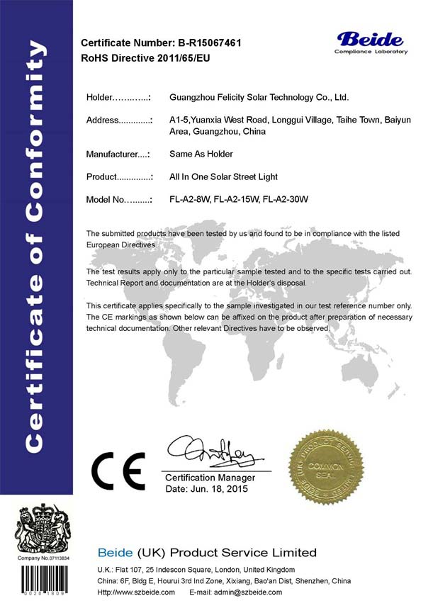 වීදි ලාම්පු සියල්ල එකකින් සවි කිරීම සඳහා 7461 ROHS සහතිකය 2020-04-22