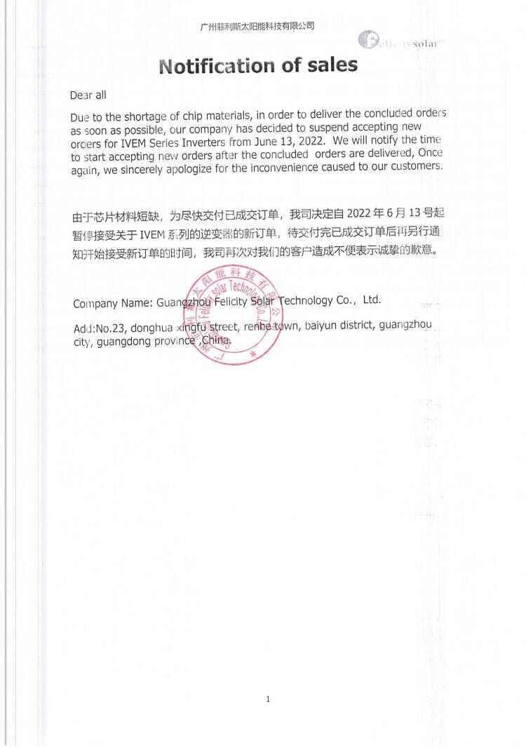 由于芯片材料短缺,为尽快交付已成交订单,我司决定自2 022年6月13号起暂停接受关于IVEM系列的逆变器的新订单,待交付完已成交订单后再另行通知开始接受新订单的时间,我司再次对我们的客户造成不便表示诚挚的歉意。